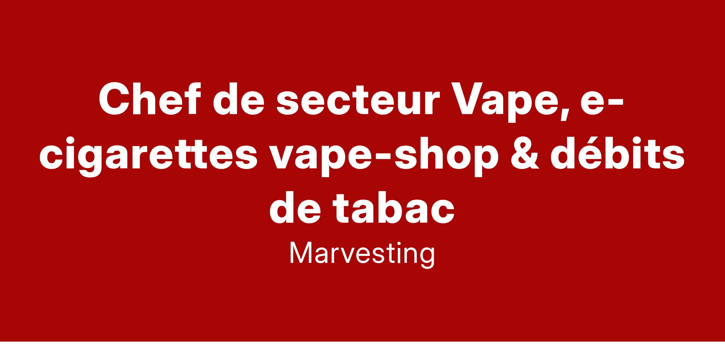Dans le cadre de son développement Marvesting recrute aujourd'hui des chefs de secteur H/F spécialisés dans l’univers de la vape / vapotage (gamme e-cigarettes tabac & vape-shop)